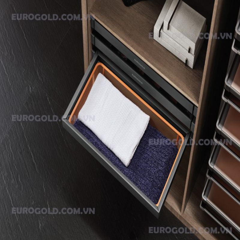 – Giỏ để đồ gấp, ray giảm chấn, lưới cao cấp có thể sẽ là điểm nhấn cho tủ quần áo với màu nâu thẫm và chất liệu mây gần gũi tạo nên sự hiện đại, ấm cúng cho gia đình.